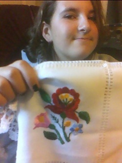 …with folksy flowers typical of Eastern European needlepoint, as shown by Thing Two…